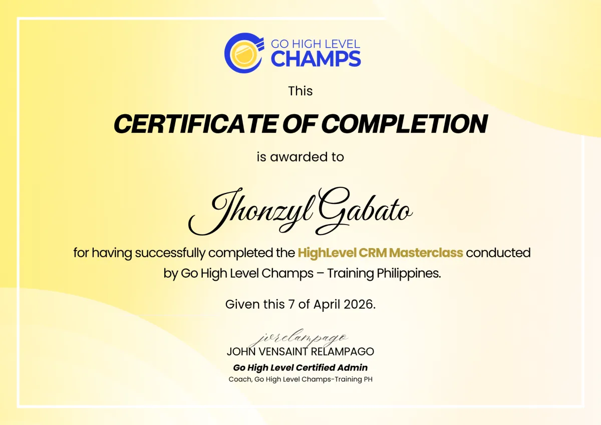 This certification acknowledges my completion of the Go High Level Funnel Building Masterclass, an in-depth training on funnel systems and automation, equipping me with the tools to help businesses scale faster with clarity and confidence.